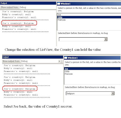 For example, run the demo program (code is below), select Joe in the ListView, and select Belgium in the ComboBox. Now you change the ListView to select Eddy. The first binding reset the ItemSource, which has a side-effect of changing the selection. For the old selected item does not belong to the items collection any more, the ComboBox resets its selection to null. This action put null into Joe’s selectedCountry (Not Eddy) because the second binding has not been notified about the change of DataContext yet. So when you click back to Joe, it selection is null.
